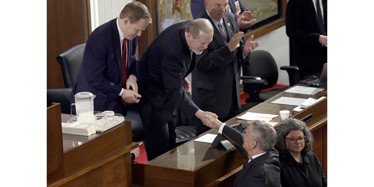 Speaker of the House Destin Hall, top left, and Senate leader Phil Berger, top center, greet North Carolina Gov. Josh Stein, bottom right, as he arrives to deliver the State of the State address at the Legislative Building on March 12 in Raleigh. (Chris Seward / AP Photo)