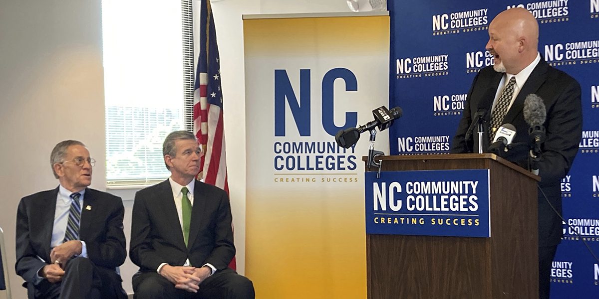 North Carolina Community Colleges System President Jeff Cox, right, speaks as then-Gov. Roy Cooper, center, and State Board of Community Colleges Chair Burr Sullivan listen during a 2023 news conference announcing his hiring. Cox is planning to retire next year, and the system is beginning its search for his successor. (Gary D. Robertson / AP Photo)