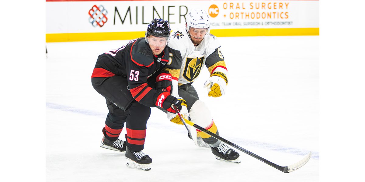 Hurricanes forward Jackson Blake battles for position against Vegas defenseman Jeremy Lauzon during Carolina’s 6-3 loss to the Golden Knights on Tuesday at Lenovo Center. (James Jackson / For North State Journal)
