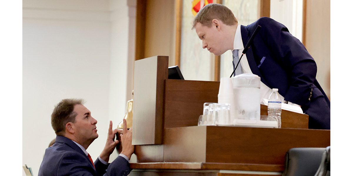 Speaker of the House Destin Hall (R-Granite Falls) right, talks with Rep. John Bell (R-Wayne) during debate of a redistricting bill at the Legislative Building on Oct. 22 in Raleigh. (Chris Seward / AP Photo)
