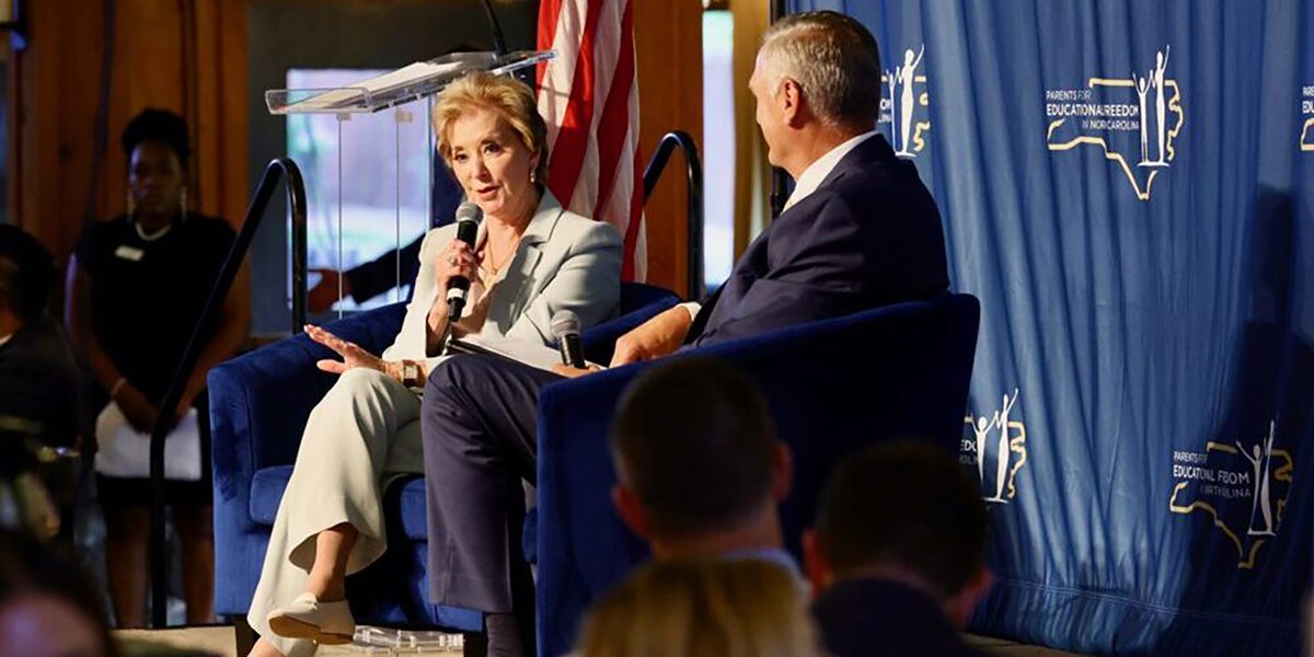 NSJ_A1.School Choice U.S. Education Secretary Linda McMahon and PEFNC President Mike Long talk during a fireside chat at the organization’s 20th Anniversary Gala held June 25. (Courtesy PEFNC)