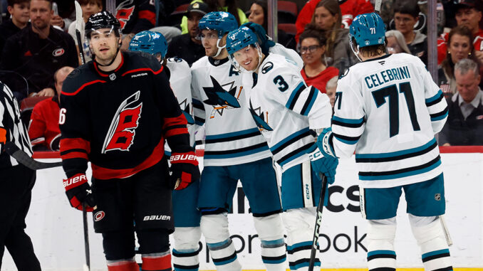 After Jordan Martinook failed to clear the puck out of the zone at the Carolina blue line, Sharks winger Will Smith got the puck to Macklin Celebrini. San Jose’s sophomore phenom made a perfect pass to Collin Graf for a tap-in and a 1-0 lead 33 seconds into the game.