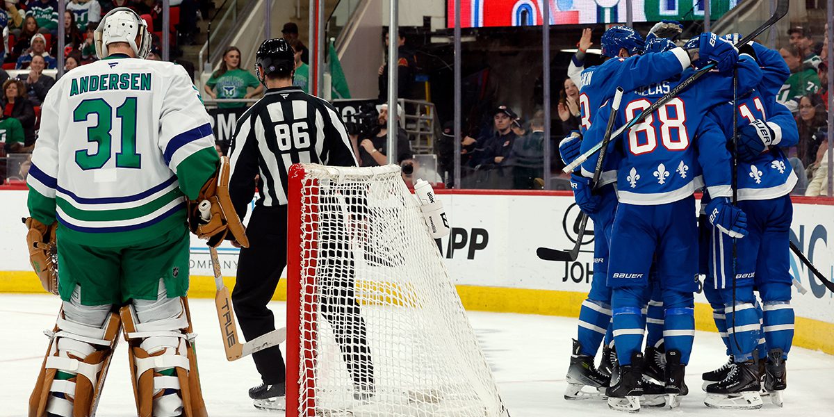 Avalanche Hurricanes Hockey The Avalanche celebrate a goal by Brock Nelson while Hurricanes goaltender Frederik Andersen stands near the net during Colorado’s 5-3 win Saturday in Raleigh. (Karl DeBlaker / AP Photo)