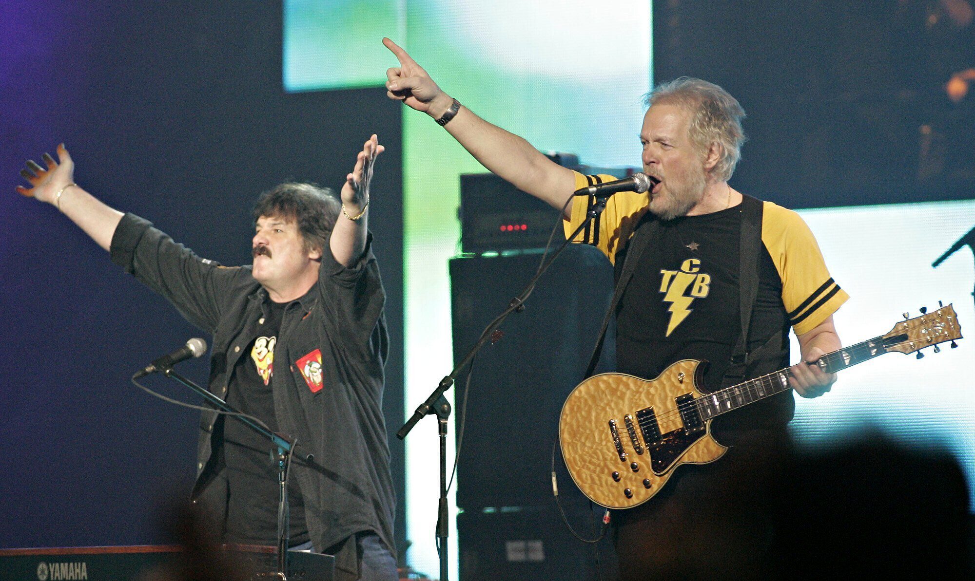 Burton Cummings and Randy Bachman, left, of The Guess Who, pictured performing at the Juno Awards in Winnipeg in 2005 are embarking on their first tour in twenty years. (Marianne Helm / The Canadian Press via AP)