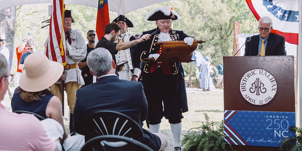 NSJ_A1.America250.NCG North Carolina Gov. Josh Stein, seated right, looks on during a ceremony Sunday honoring the 250th anniversary of the Halifax Resolves in Historic Halifax. (Courtesy @NC_Governor / X)